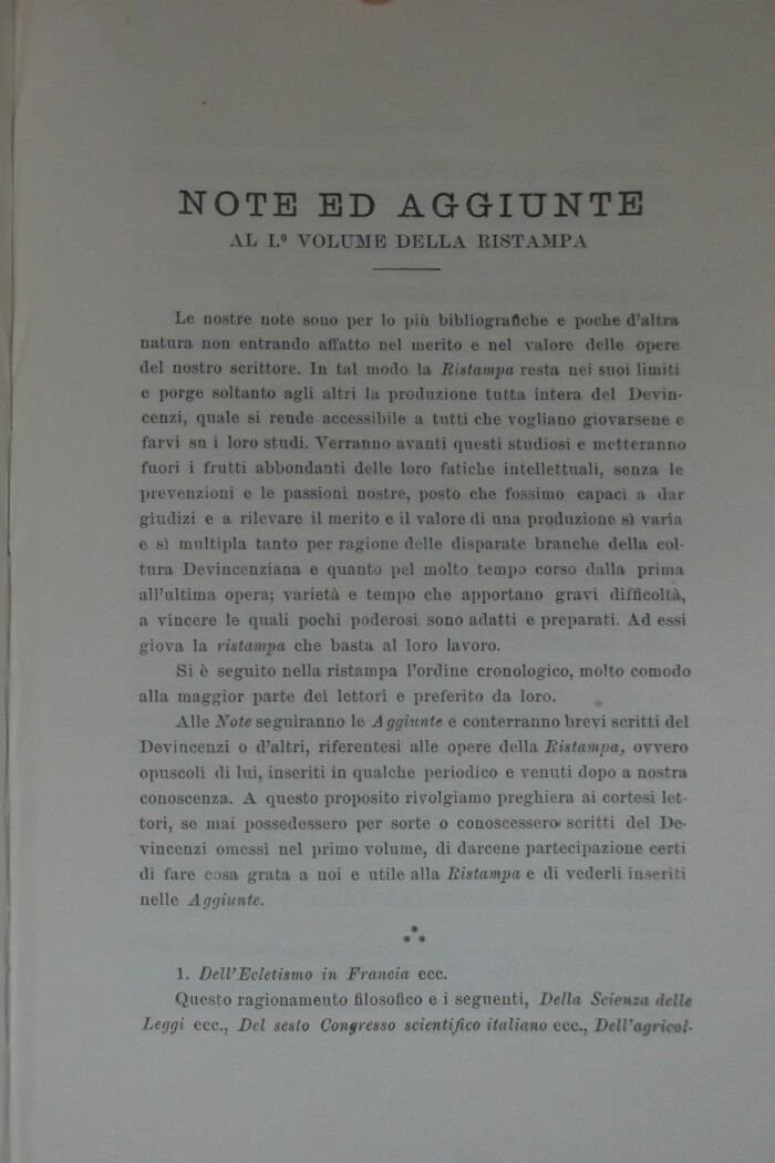 Alle Note seguiranno le A ggiunte e conterranno brevi scritti del Devincenzi o d'altri, riferentesi alle opere della Ristampa, ovvero opuscoli di lui, inseriti in qualche periodico e venuti dopo a nostra conoscenza. A questo proposito rivolgiamo preghiera ai cortesi lettori, se mai possedessero per sorte o conoscessero* scritti del Devincenzi omessi nel primo volume, di darcene partecipazione certi di fare cosa grata a noi e utile alla Ristampa e di vederli inseriti nelle Aggiunte.