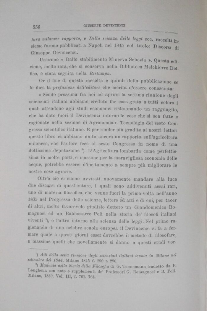 Oltr'a ciò ci siamo avvisati nuovamente mandare alla luce due discorsi di quest'autore, i quali sono addivenuti assai rari, uno di materia filosofica, che venne fuori la prima volta nell'anno 1835 nel Progresso delle scienze, lettere ed arti e di cui, per tacer di altri, molto favorevole giudizio dettero un Giandomenico Ro-magnosi ed un Baldassarre Poli nella storia de' filosofi italiani viventi '), e l'altro intorno alla scienza delle leggi. Nel primo ragionando di una celebre scuola europea il Devincenzi si fa a fermare quale a questi giorni esser dovrebbe il metodo di filosofare, e massime quelli che novellamente si danno a questi studi vor-