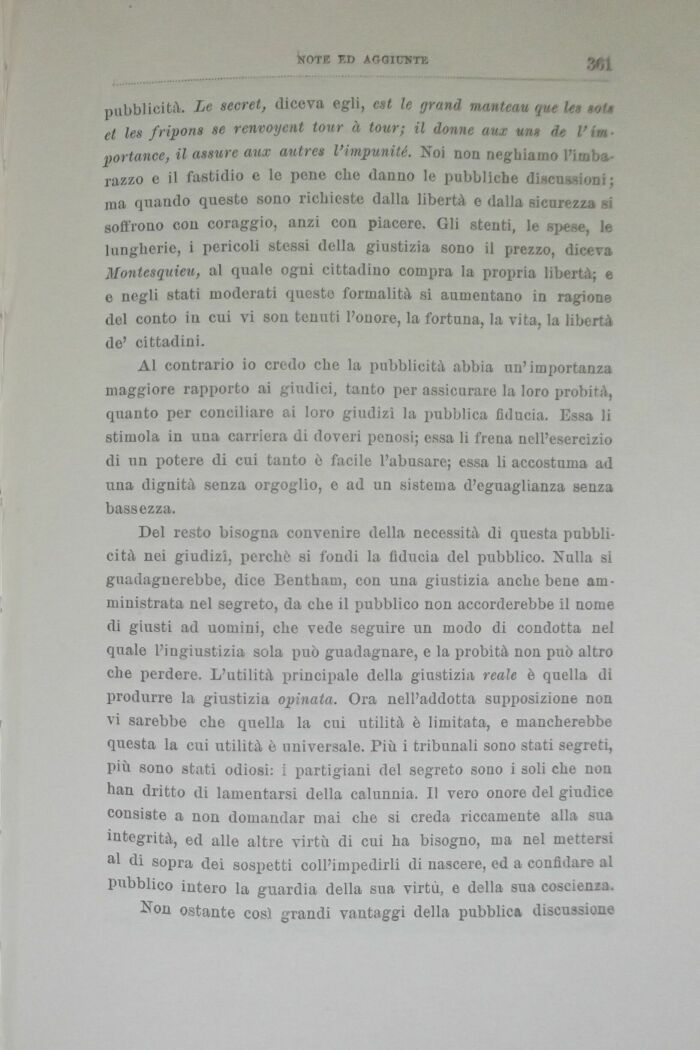 Al contrario io credo che la pubblicità abbia un'importanza maggiore rapporto ai giudici, tanto per assicurare la loro probità, quanto per conciliare ai loro giudizi la pubblica fiducia. Essa li stimola in una carriera di doveri penosi; essa li frena nell'esercizio di un potere di cui tanto è facile l'abusare; essa li accostuma ad una dignità senza orgoglio, e ad un sistema d'eguaglianza senza bassezza.