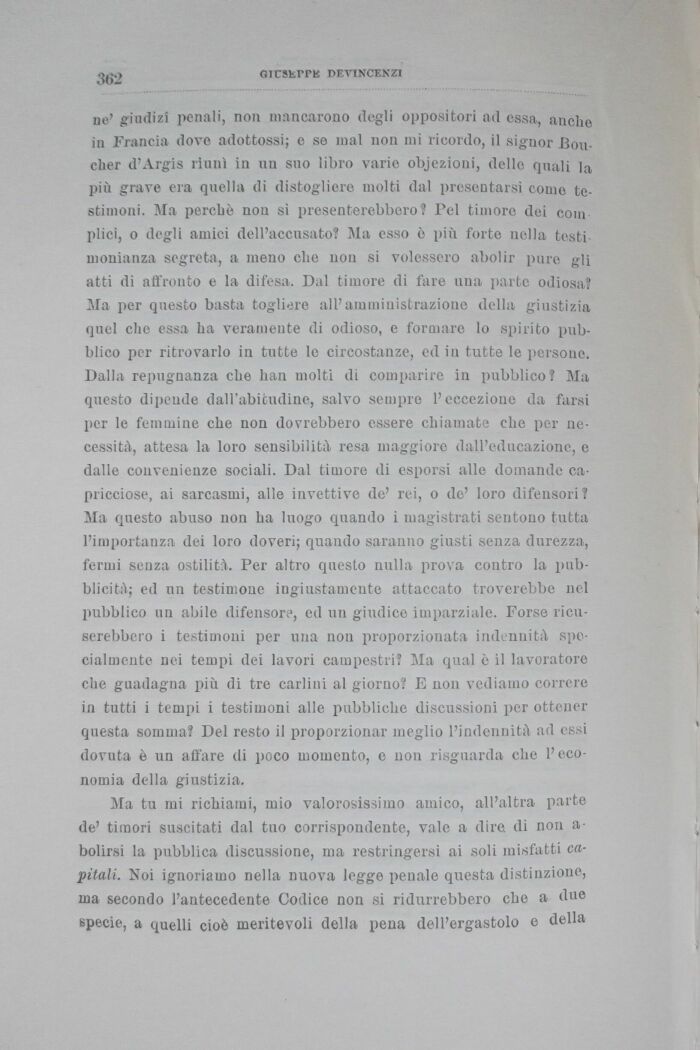 Ma tu mi richiami, mio valorosissimo amico, all'altra parte de' timori suscitati dal tuo corrispondente, vale a dire, di non a-bolirsi la pubblica discussione, ma restringersi ai soli misfatti capitali. Noi ignoriamo nella nuova legge penale questa distinzione, ina secondo l'antecedente Codice non si ridurrebbero che a due specie, a quelli cioè meritevoli della pena dell'ergastolo e della