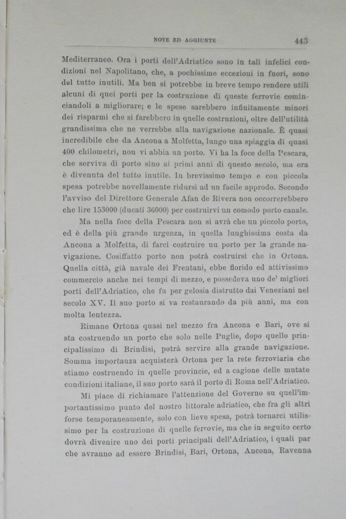 Mediterraneo. Ora i porti dell'Adriatico sono in tali infelici condizioni nel Napolitano, clie, a pochissime eccezioni in fuori, sono del tutto inutili. Ma ben si potrebbe in breve tempo rendere utili alcuni di quei porti per la costruzione di queste ferrovie cominciandoli a migliorare; e le spese sarebbero infinitamente minori dei risparmi che si farebbero in quelle costruzioni, oltre dell'utilità grandissima che ne verrebbe alla navigazione nazionale. È quasi incredibile che da Ancona a Molfetta, lungo una spiaggia di quasi 400 chilometri, non vi abbia un porto. Vi ha la foce della Pescara, che serviva di porto sino ai primi anni di questo secolo, ma ora è divenuta del tutto inutile. In brevissimo tempo e con piccola spesa potrebbe novellamente ridursi ad un facile approdo. Secondo l'avviso del Direttore Generale Afan de Ri vera non occorrerebbero che lire 153000 (ducati 36000) per costruirvi un comodo porto canale.