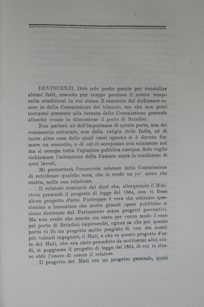 Il relatore cominciò dal dirci che, allorquando il Ministero presentò il progetto di legge del 1864, non vi fosse alcun progetto d'arte. Purtroppo è vero che abbiamo spessissimo a lamentare che molte grandi opere pubbliche si siano decretate dal Parlamento senza progetti preventivi. Ma non credo che questo sia stato per verun modo il caso pel porto di Brindisi; imperocché, ognun sa che per questo porto vi fu un progetto molto pregiato di uno dei nostri più valenti ingegneri, il Mati, e che su questo progetto d'arte del Mati, che era stato preceduto da moltissimi altri studi, si poggiasse il progetto di legge del 1864, di cui io stesso ebbi l'onore di essere il relatore.
