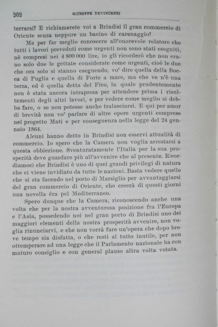 Spero dunque che la Camera, riconoscendo anche una volta che per la nostra avventurosa posizione fra l'Europa e l'Asia, possedendo noi nel gran porto di Brindisi uno dei maggiori elementi della nostra prosperità avvenire, non voglia rinunciarvi, e che non vorrà fare un'opera che dopo breve tempo sia disfatta, o che resti al tutto inutile, per non ottemperare ad una legge che il Parlamento nazionale ha con maturo consiglio e con general plauso altra volta votata.