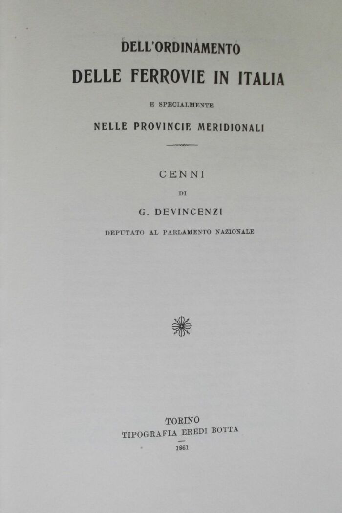 DELL'ORDINAMENTO DELLE FERROVIE IN ITALIA E SPECIALMENTE NELLE PROVINCIE MERIDIONALI CENNI DI G. DE VINCENZI DEPUTATO AL PARLAMENTO NAZIONALE TORINO TIPOGRAFIAJ3REDI BOTTA 1861
