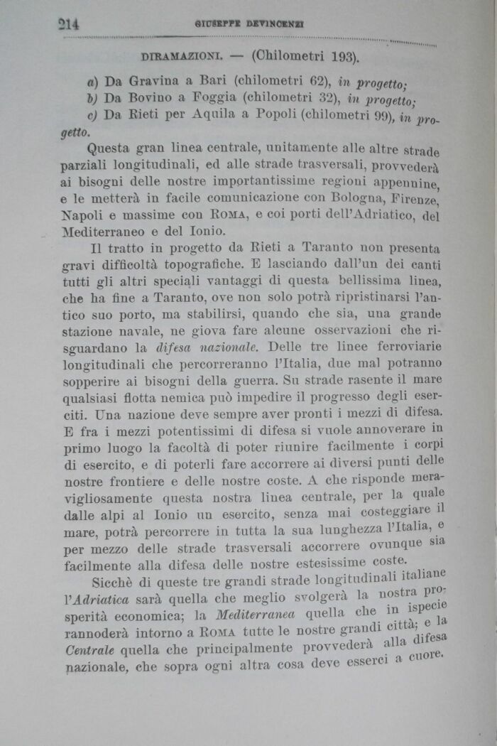 Il tratto in progetto da Rieti a Taranto non presenta gravi difficoltà topografiche. E lasciando dall'un dei canti tutti gli altri speciali vantaggi di questa bellissima linea, che ha fine a Taranto, ove non solo potrà ripristinarsi l'antico suo porto, ma stabilirsi, quando che sia, una grande stazione navale, ne giova fare alcune osservazioni che ri-sguardano la difesa nazionale. Delle tre linee ferroviarie longitudinali che percorreranno l'Italia, due mal potranno sopperire ai bisogni della guerra. Su strade rasente il mare qualsiasi flotta nemica può impedire il progresso degli eserciti. Una nazione deve sempre aver pronti i mezzi di difesa. E fra i mezzi potentissimi di difesa si vuole annoverare in primo luogo la facoltà di poter riunire facilmente i corpi di esercito, e di poterli fare accorrere ai diversi punti delle nostre frontiere e delle nostre coste. A che risponde meravigliosamente questa nostra linea centrale, per la quale dalle alpi al Ionio un esercito, senza mai costeggiare il mare, potrà percorrere in tutta la sua lunghezza l'Italia, e per mezzo delle strade trasversali accorrere ovunque sia facilmente alla difesa delle nostre estesissime coste.