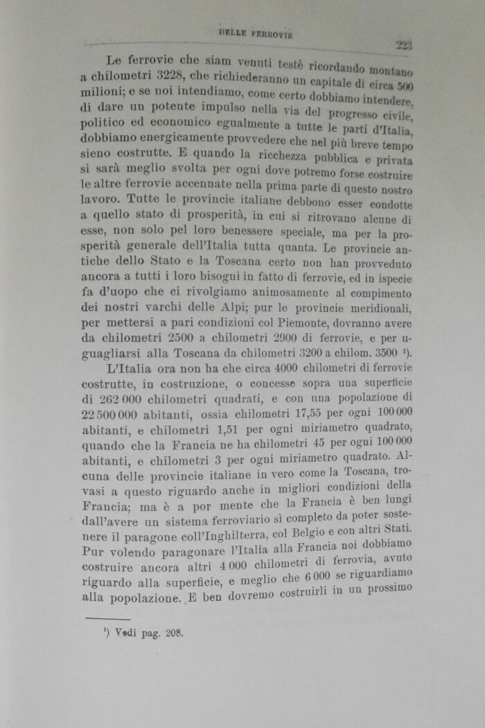 L'Italia ora non ha che circa 4000 chilometri di ferrovie costrutte, in costruzione, o concesse sopra una superficie di 262 000 chilometri quadrati, e con una popolazione di 22500000 abitanti, ossia chilometri 17,55 per ogni 100000 abitanti, e chilometri 1,51 per ogni miriametro quadrato, quando che la Francia ne ha chilometri 45 per ogni 100 000 abitanti, e chilometri 3 per ogni miriametro quadrato. Alcuna delle provincie italiane in vero come la Toscana, trovasi a questo riguardo anche in migliori condizioni della