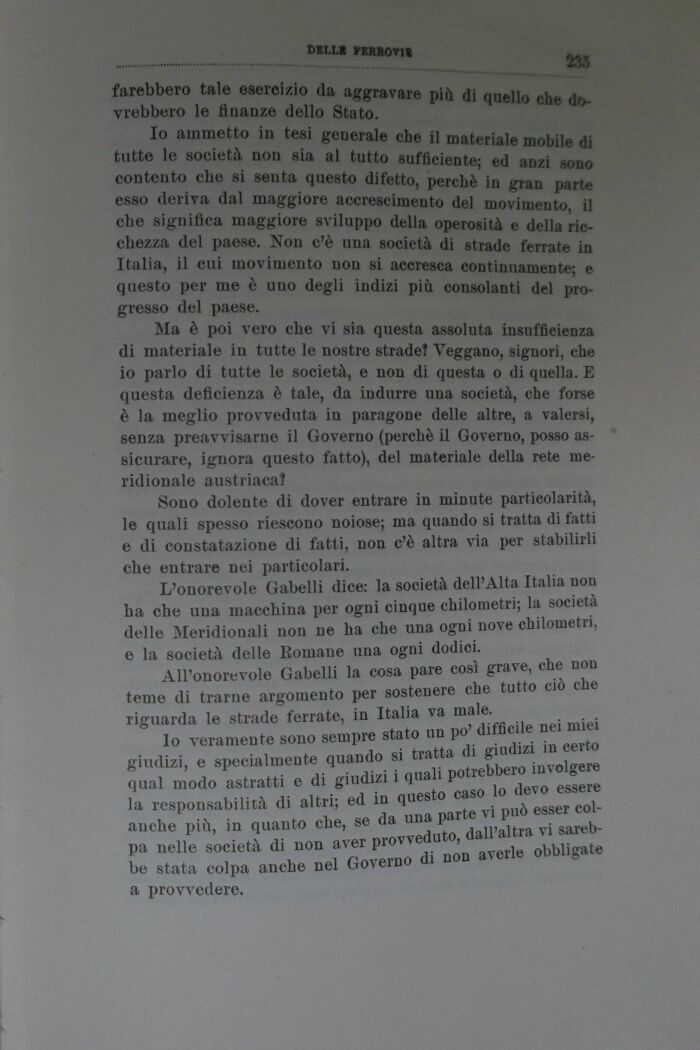 Io ammetto in tesi generale che il materiale mobile di tutte le società non sia al tutto sufficiente; ed anzi lo contento che si senta questo difetto, perchè in gran nart! esso deriva dal maggiore accrescimento del movimento il che significa maggiore sviluppo della operosità e della rie chezza del paese. Non c'è una società di strade ferrate in Italia, il cui movimento non si accresca continuamente- e questo per me è uno degli indizi più consolanti del progresso del paese.