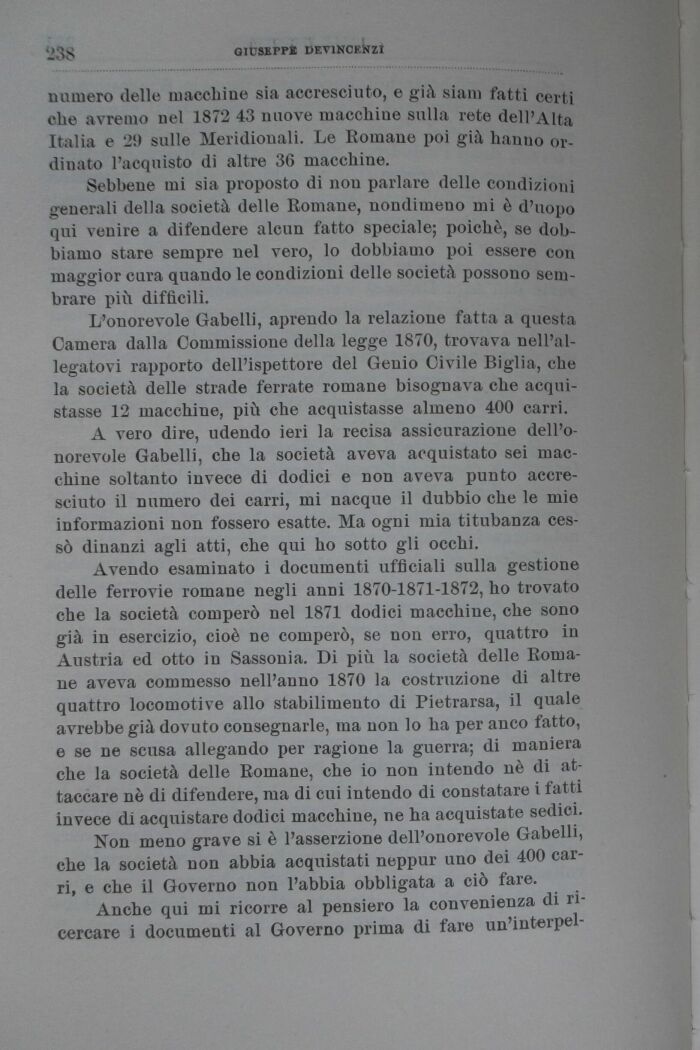 Avendo esaminato i documenti ufficiali sulla gestione delle ferrovie romane negli anni 1870-1871-1872, ho trovato che la società comperò nel 1871 dodici macchine, che sono già in esercizio, cioè ne comperò, se non erro, quattro in Austria ed otto in Sassonia. Di più la società delle Romane aveva commesso nell'anno 1870 la costruzione di altre quattro locomotive allo stabilimento di Pietrarsa, il quale avrebbe già dovuto consegnarle, ma non lo ha per anco fatto, e se ne scusa allegando per ragione la guerra; di maniera che la società delle Romane, che io non intendo nè di attaccare nè di difendere, ma di cui intendo di constatare i fatti invece di acquistare dodici macchine, ne ha acquistate sedici.