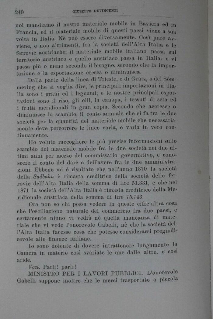 Ho voluto raccogliere le più precise informazioni sullo scambio del materiale mobile fra le due società nei due ultimi anni per mezzo del commissario governativo, e conoscere il conto del dare e dell'avere fra le due amministrazioni. Ebbene mi è risultato che nell'anno 1870 la società della Sudbahn è rimasta creditrice della società delle ferrovie dell'Alta Italia della somma di lire 51.331, e che nel 1871 la società dell'Alta Italia è rimasta creditrice della Meridionale austriaca della somma di lire 75.743.