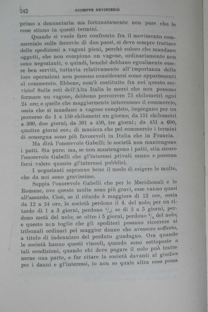 Sappia l'onorevole Gabelli che per le Meridionali e le Romane, ove queste multe sono più gravi, esse vanno quasi all'assurdo. Cioè, se il ritardo è maggiore di 12 ore, ossia da 12 a 24 ore, le società perdono il 4. del nolo; per un ritardo di 1 a 3 giorni, perdono l/3; se di 3 a 5 giorni, perdono metà del nolo; se oltre i 5 giorni, perdono 2/3 del nolo; e questo ncn toglie che gli speditori possano ricorrere ai tribunali ordinari pel maggior danno che avessero sofferto, a titolo di indennizzo del perduto guadagno. Ora quando le società hanno questi vincoli, quando sono sottoposte a tali condizioni, quando chi deve pagare il nolo può trattenerne una parte, e far citare la società davanti al giudice per i danni e gl'interessi, io non so quale altra cosa possa