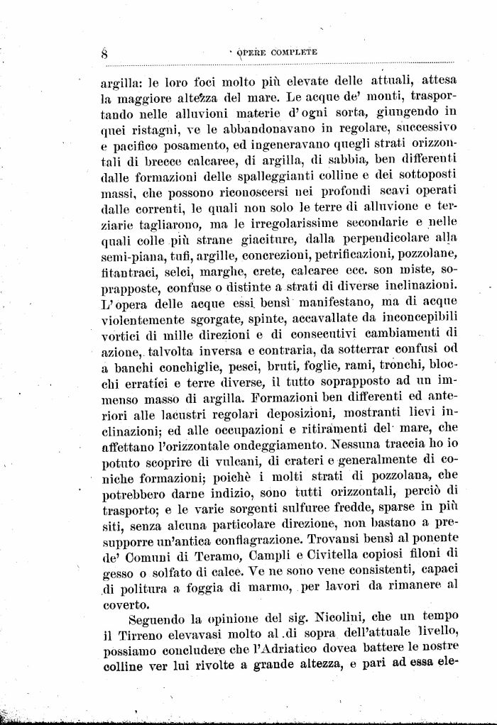 argilla: le loro foci molto più elevate delle attuali, attesa la maggiore altezza del mare. Le acque de' monti, trasportando nelle alluvioni materie d'ogni sorta, giungendo in quei ristagni, ve le abbandonavano in regolare, successivo e pacifico pesamento, ed ingeneravano quegli strati orizzontali di brecce calcaree, di argilla, di sabbia, ben differenti dalle formazioni delle spalleggianti colline e dei sottoposti massi, clie possono riconoscersi nei profondi scavi operati dalle correnti, le quali non solo le terre di alluvione e terziarie tagliarono, ma le irregolarissime secondarie e nelle quali colle più strane giaciture, dalla perpendicolare alla semi-piana, tufi, argille, concrezioni, petrificazioni, pozzolane, titantraci, selci, marghe, crete, calcaree ecc. son miste, soprapposte, confuse o distinte a strati di diverse inclinazioni. L'opera delle acque essi bensì manifestano, ma di acque violentemente sgorgate, spinte, accavallate da inconcepibili vortici di mille direzioni e di consecutivi cambiamenti di azione, talvolta inversa e contraria, da sotterrar confusi od a banchi conchiglie, pesci, bruti, foglie, rami, tronchi, blocchi erratici e terre diverse, il tutto soprapposto ad un immenso masso di argilla. Formazioni ben differenti ed anteriori alle lacustri regolari deposizioni, mostranti lievi inclinazioni; ed alle occupazioni e ritiramenti del mare, che affettano l'orizzontale ondeggiamento. Nessuna traccia ho io potuto scoprire di vulcani, di crateri e generalmente di coniche formazioni; poiché i molti strati di pozzolana, che potrebbero darne indizio, sono tutti orizzontali, perciò di trasporto; e le varie sorgenti sulfuree fredde, sparse in più siti, senza alcuna particolare direzione, non bastano a presupporre un'antica conflagrazione. Trovansi bensì al ponente de' Comuni di Teramo, Campii e Civitella copiosi filoni di gesso o solfato di calce. Ve ne sono vene consistenti, capaci .di politura a foggia di marmo, per lavori da rimanere al coverto.