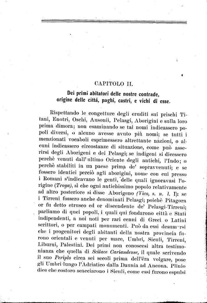 Eispettando le congetture degli eruditi sui prischi Titani, Enotri, Oschi, Ausonii, Pelasgi, Aborigini e sulla loro prima dimora; non esaminando se tai nomi indicassero popoli diversi, o alcuno avesse avuto più nomi; se tutti i menzionati vocaboli esprimessero altrettante nazioni, o alcuni indicassero circostanze di situazione, come può asserirsi degli Aborigeni e dei Pelasgi; se indigeni si dicessero perché venuti dall'ultimo Oriente degli antichi, l'Indo; o perché stabiliti iu un paese prima de' sopravvenuti; e se fossero identici perciò agli aborigini, nome con cui presso i Koniani s'indicavano le genti, delle quali ignora vasi l'origine (Troya), sì che ogni antichissimo popolo relativamente ad altro posteriore si disse Aborigeno (Vico, s. n. I. I): se i Tirreni fossero anche denominati Pelasgi; poiché Pitagora or fu detto etrusco ed or discendente de' Pelasgi-Tirreni; parliamo di quei popoli, i quali qui fondarono città e Stati indipendenti, a noi noti per rari cenni di Greci o Latini scrittori, o per campati monumenti. Può da essi desumersi che i progenitori degli abitanti della nostra provincia furono orientali e venuti per mare, Umbri, Siculi, Tirreni, Liburni, Palestini. Dei primi non conoscesi altra testimonianza che quella di Sottace Cariandeme, il quale scrivendo il suo Periplo circa sei secoli prima dell'era volgare, pose gli Umbri'lungo l'Adriatico dalla Daunia ad Ancona. Plinio dice che costoro scacciarono i Siculi, come essi furono espulsi