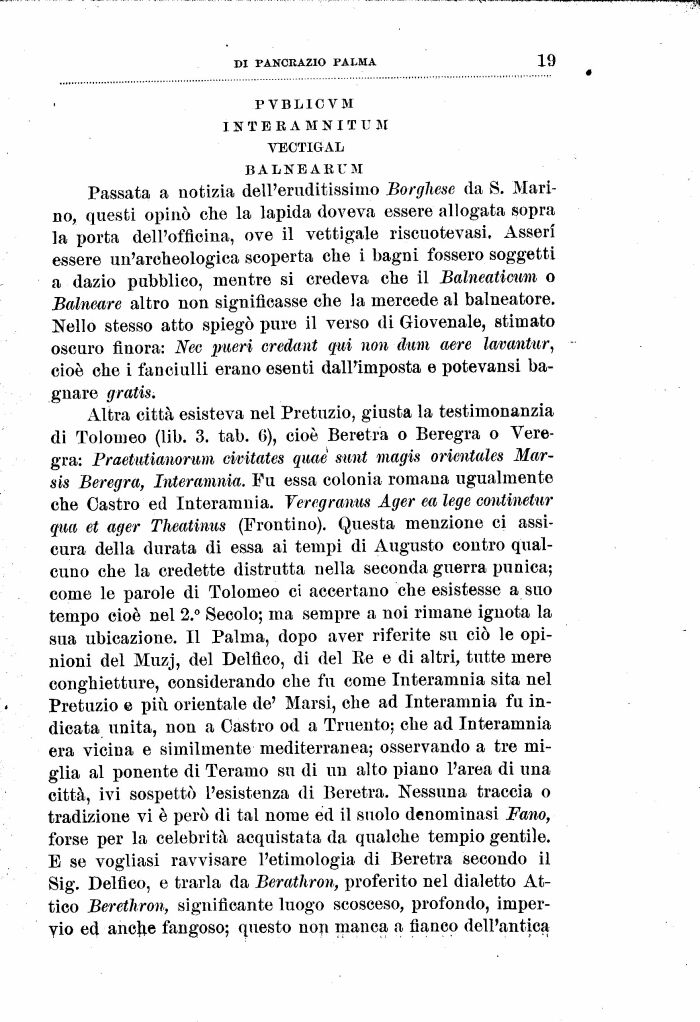 Altra città esisteva nel Pretuzio, giusta la testimonanzia di Tolomeo (lib. 3. tab. 6), cioè Beretrà o Beregra o Vere-gra: Praetutianorum civitates quaè sunt magis orientale» Mar-sis Beregra, Interamnia. Fu essa colonia romana ugualmente che Castro ed Interamnia. Veregranus Ager ea lege continetur qua et ager Theatinus (Frontino). Questa menzione ci assicura della durata di essa ai tempi di Augusto contro qualcuno che la credette distrutta nella seconda guerra punica; come le parole di Tolomeo ci accertano che esistesse a suo tempo cioè nel 2.° Secolo; ma sempre a noi rimane ignota la sua ubicazione. Il Palma, dopo aver riferite su ciò le opinioni del Muzj, del Delfico, di del Re e di altri, tutte mere conghletture, considerando che fu come Interamnia sita nel Pretuzio e più orientale de' Marsi, che ad Interamnia fu indicata unita, non a Castro od a Truento; che ad Interamnia era vicina e slmilmente mediterranea; osservando a tre miglia al ponente di Teramo su di un alto piano l'area di una città, ivi sospettò l'esistenza di Beretrà. Nessuna traccia o tradizione vi è però di tal nome ed il suolo denominasi Fano, forse per la celebrità acquistata da qualche tempio gentile. E se vogliasi ravvisare l'etimologia di Beretrà secondo il Sig. Delfico, e trarla da Berathron, proferito nel dialetto Attico Beretliron, significante luogo scosceso, profondo, iniper-yio ed ancfte fangoso; questo non manca a fianco dell'antica