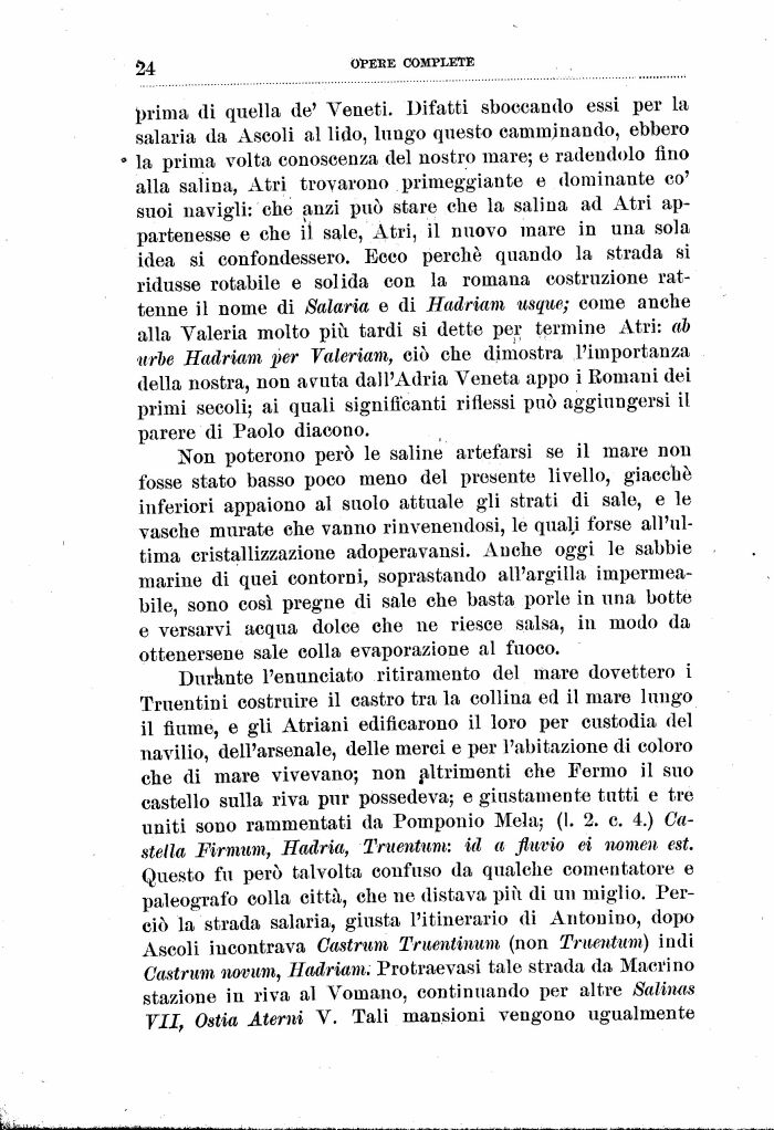 prima di quella de' Veneti. Difatti sboccando essi per la salaria da Ascoli al lido, lungo questo cammjnando, ebbero * la prima volta conoscenza del nostro mare; e radendolo fino alla salina, Atri trovarono primeggiante e dominante co' suoi navigli: che anzi può stare che la salina ad Atri appartenesse e che il sale, Atri, il nuovo mare in una sola idea si confondessero. Ecco perché quando la strada si ridusse rotabile e solida con la romana costruzione rat-tenne il nome di Salaria e di Hadriam usque; come anche alla Valerla molto più tardi si dette per termine Atri: al urie Hadriam per Valeriam, ciò che dimostra l'importanza della nostra, non avoita dall'Adria Veneta appo i Romani dei primi secoli; ai quali significanti riflessi può aggiungersi il parere di Paolo diacono.