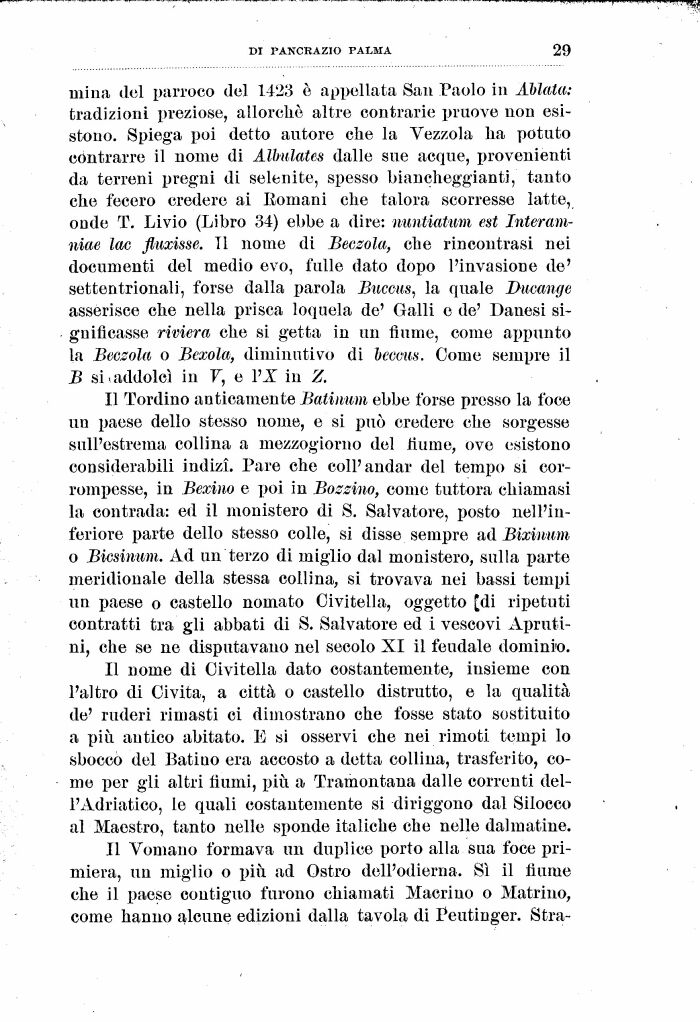 mina del parroco del 1423 è appellata San Paolo in Abietta: tradizioni preziose, allorché altre contrarie pruove non esistono. Spiega poi detto autore che la Vezzola ha potuto contrarre il nome di Allmlates dalle sue acque, provenienti da terreni pregni di selenite, spesso biancheggianti, tanto che fecero credere ai Eomani che talora scorresse latte, onde T. Livio (Libro 34) ebbe a dire: nuntiatum est Interam-niae lac fluxisse. TI nome di Becsolu, che rincontrasi nei documenti del medio evo, fulle dato dopo l'invasione de' settentrionali, forse dalla parola Buccus, la quale Ducange asserisce che nella prisca loquela de' Galli e de' Danesi significasse riviera che si getta in un fiume, come appunto la Becsolu o Bexolu, diminutivo di beccus. Come sempre il B si < addolcì in F, e VX in Z.