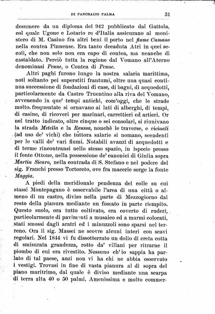 Altri paghi furono lungo la nostra salaria marittima, noti soltanto pei superstiti frantumi, oltre una quasi continua successione di fondazioni di case, di bagni, di acquedotti, particolarmente da Castro Truentino alla riva del Tornano, avvenendo in que' tempi antichi, com'oggi, che le strade molto, frequentate si ornavano ai lati di alberghi, di tempi, di casine, di ricoveri per marinari, carrettieri ed artieri. Or nel tratto indicato, oltre cinque o sei consolari, si riunivano la strada Metella e la Baussa, nonché le traverse, e vicinali . (ad uso de' vichi) che tuttora salane si nomano, scendenti per le valli de' vari fiumi. Notabili avanzi di acquedotti e di terme rincontransi nello stesso spazio, in ispecie presso il fonte Ottone, nella possessione de' canonici di Giulia sopra Martin Sicuro, nella contrada di S. Stefano e nel podere del sig. Franchi presso Tortoreto, ove fra macerie sorge la fonte Maggia.