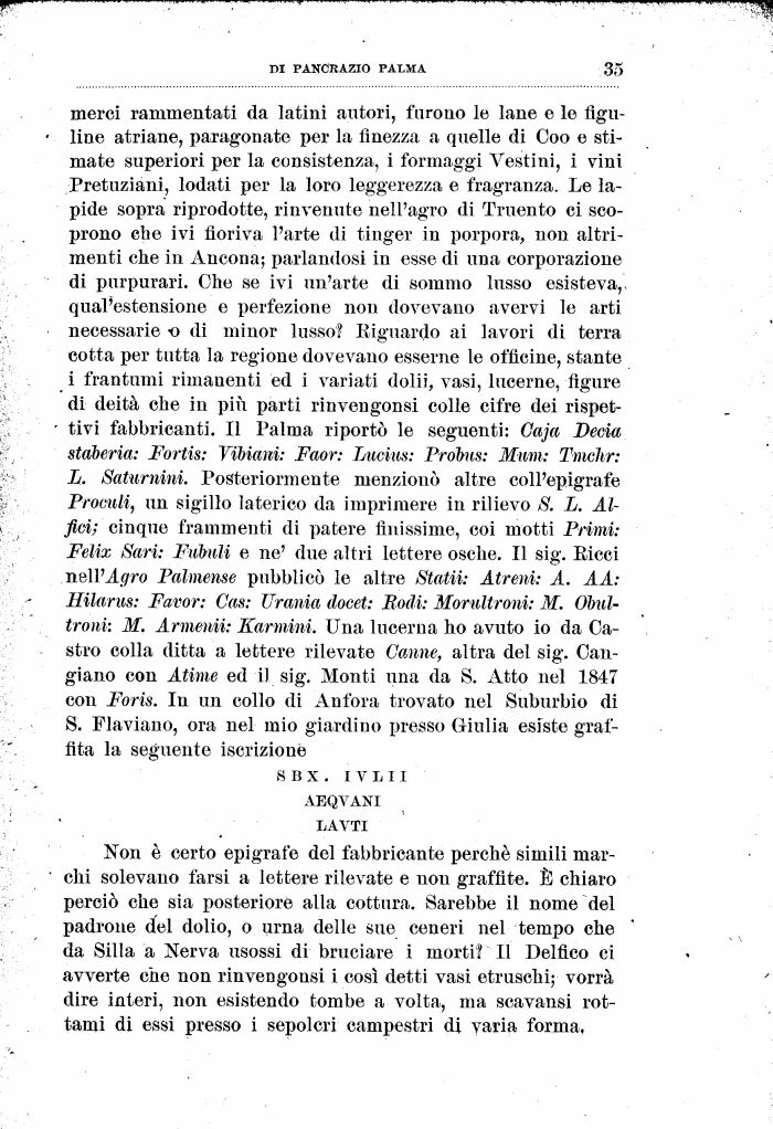 Non è certo epigrafe del fabbricante perché simili mar-. chi solevano farsi a lettere rilevate e non graffito. È chiaro perciò che sia posteriore alla cottura. Sarebbe il nome del padrone del dolio, o urna delle sue ceneri nel tempo che da Siila a Nerva usossi di bruciare i morti! Il Delfico ci avverte che non rinvengonsi i così detti vasi etruschi; vorrà dire interi, non esistendo tombe a volta, ma scavansi rottami di essi presso i sepolcri campestri di varia forma.