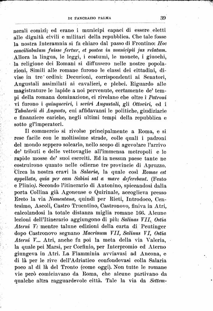 Il commercio si rivolse principalmente a Eoma, e si rese facile con le moltissime strade, colle quali i padroni del mondo seppero solcarlo, nello scopo di agevolare l'arrivo de' tributi e delle vettovaglie all'immensa metropoli e le rapide mosse de' suoi eserciti. Ed in nessun paese tante ne costruirono quanto nelle odierne tre provincie di Apruzzo. Circa la nostra eravi la Salaria, la quale così Romae est appellata, quia per eam Sabini sai a mare deferebant. (Festo e PlinioJ. Secondo l'itinerario di Antonino, spiccandosi dalla porta Collina già Agonense o Quirinale, accoglieva presso Ereto la via Nomentana, quindi per Eieti, Introdoco, Centesimo, Ascoli, Castro Truentino, Castronovo, finiva in Atri, calcolandosi la totale distanza miglia romane 166. Alcune lezioni dell'Itinerario aggiungono di più: Salinas VII, Ostia Aterni V: mentre talune edizioni della carta di Peutinger dopo Castronovo segnano Macrinum VII, Salinm VI, Ostia Aterni V... Atri, anche fu poi la meta della via Valerla, la quale pei Marsi, per Corfinio, per Interpromio ed Aterno giungeva in Atri. La Flamminia avviavasi ad Ancona, e di là per le rive dell'Adriatico confondeva»! colla Salaria poco al di là del Tronto (come oggi). Non tutte le romane vie però corniciavano da Eoma, che alcune partivano da qualche altra ragguardevole città. Tale la via da Settem-