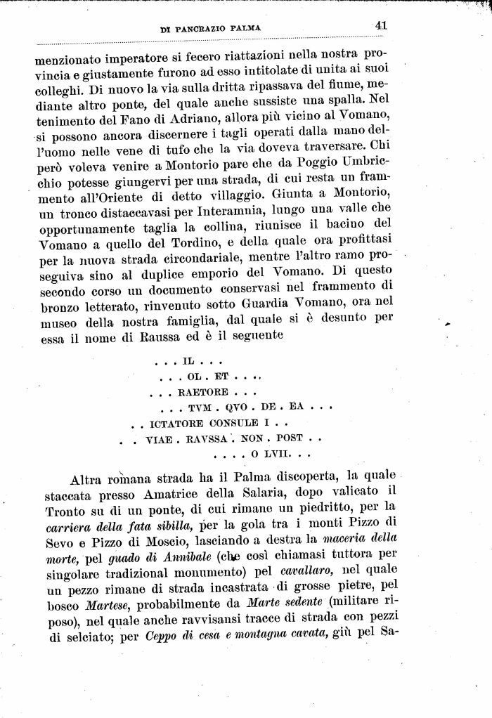 Altra romana strada ha il Palma discoperta, la quale staccata presso Amatrice della Salaria, dopo valicato il Tronto su di un ponte, di cui rimane un piedritto, per la carriera della fata sibilla, per la gola tra i monti Pizzo di Bevo e Pizzo di Moscio, lasciando a destra la maceria della morte, pel guado di Annibale (che così chiamasi tuttora per singolare tradizional monumento) pel cavallaro, nel quale un pezzo rimane di strada incastrata di grosse pietre, pel bosco Martese, probabilmente da Marte sedente (militare riposo), nel quale anche ravvisansi tracce di strada con pezzi di selciato; per Ceppo di cesa e montagna cavata, giù pel Sa-