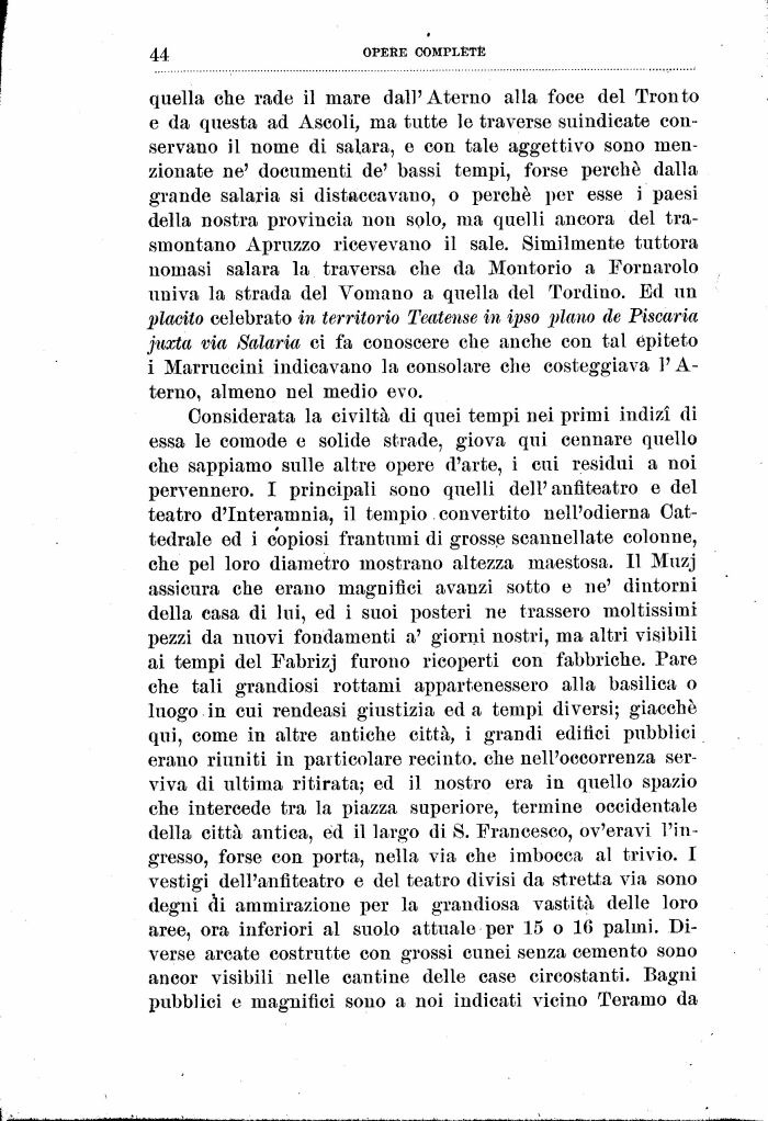 Considerata la civiltà di quei tempi nei primi indizi di essa le comode e solide strade, giova qui cennare quello che sappiamo sulle altre opere d'arte, i cui residui a noi pervennero. I principali sono quelli dell'anfiteatro e del teatro d'Interamnia, il tempio convertito nell'odierna Cattedrale ed i copiosi frantumi di grosse scannellate colonne, che pel loro diametro mostrano altezza maestosa. Il Muzj assicura che erano magnifici avanzi sotto e ne' dintorni della casa di lui, ed i suoi posteri ne trassero moltissimi pezzi da nuovi fondamenti a' giorni nostri, ma altri visibili ai tempi del Fabrizj furono ricoperti con fabbriche. Pare che tali grandiosi rottami appartenessero alla basilica o luogo in cui rendeasi giustizia ed a tempi diversi; giacché qui, come in altre antiche città, i grandi edifici pubblici erano riuniti in particolare recinto, che nell'occorrenza serviva di ultima ritirata; ed il nostro era in quello spazio che intercede tra la piazza superiore, termine occidentale della città antica, ed il largo di S. Francesco, ov'eravi l'ingresso, forse con porta, nella via che imbocca al trivio. I vestigi dell'anfiteatro e del teatro divisi da stretta via sono degni di ammirazione per la grandiosa vastità delle loro aree, ora inferiori al suolo attuale per 15 o 16 palmi. Diverse arcate costrutte con grossi cunei senza cemento sono ancor visibili nelle cantine delle case circostanti. Bagni pubblici e magnifici sono a noi indicati vicino Teramo da