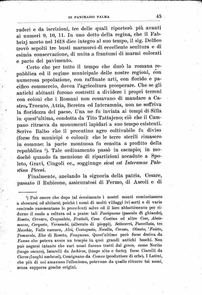 Certo che per tutto il tempo che durò la romana re-ptibblica ed il redime municipale delle nostre regioni, con numerosa popolazione, con raffinate arti, con florido e pacifico commercio, dovea l'agricoltura prosperare. Ohe se gli antichi abitanti furono costretti a dividere i propri terreni con coloni che i Romani non cessavano di mandare a Castro, Truento, Atria, Beretra ed Interamnia, non ne soffriva la floridezza del paese. Una ne fu inviata ai tempi di Siila in quest'ultima, condotta da Tito Tattajeno; ciò che il Campano ritraeva da monumenti lapidar! a suo tempo esistenti. Scrive Balbo che il precutino agro coltivabile fu diviso (forse fra municipi e coloni): che le terre sterili rimasero in comune: la parte montuosa fu censita a profitto della repubblica '). Tale ordinamento passò in esempio; in mo-dochè quando fa menzione di ripartizioni accadute a Spo-leto, Gravi, Cingoli ec., soggiunge sicut est Interamne Palestina Piceni.