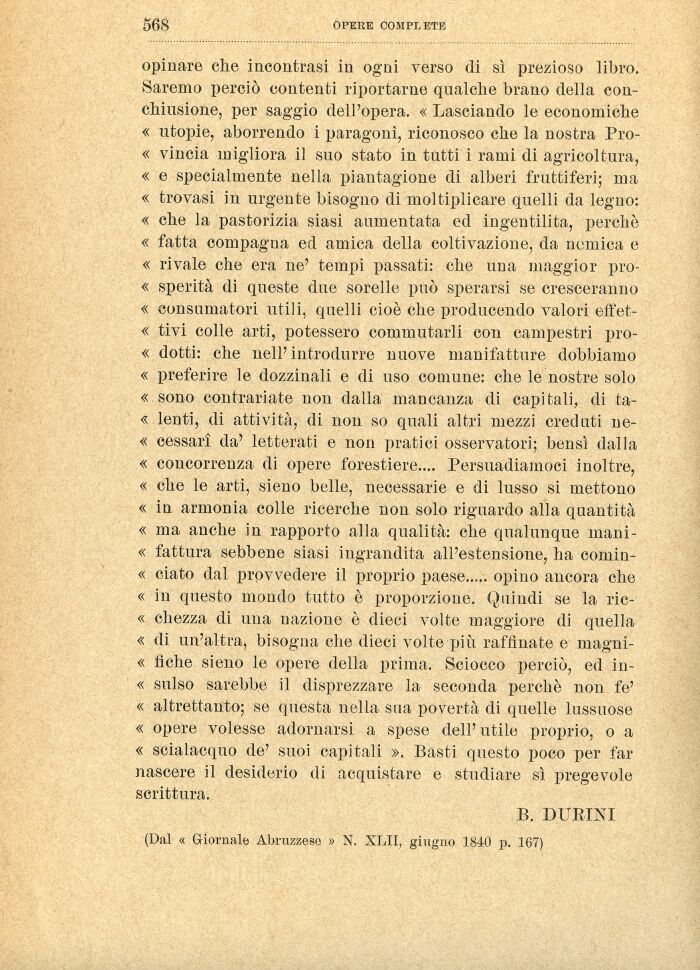 opinare che incontrasi in ogni verso di sì prezioso libro. Saremo perciò contenti riportarne qualche brano della con-chiusione, per saggio dell'opera. « Lasciando le econorniche « utopie, aborrendo i paragoni, riconosco che la nostra Pro-« vincia migliora il suo stato in tutti i rami di agricoltura, « e specialmente nella piantagione di alberi fruttiferi; ma « trovasi in urgente bisogno di moltiplicare quelli da legno: « che la pastorizia siasi aumentata ed ingentilita, perché « fatta compagna ed amica della coltivazione, da nemica e « rivale che era ne' tempi passati: che una maggior pro-« sperità di queste due sorelle può sperarsi se cresceranno « consumatori utili, quelli cioè che producendo valori effet-« tivi colle arti, potessero commutarli con campestri pro-« dotti: che nell'introdurre nuove manifatture dobbiamo « preferire le dozzinali e di uso comune: che le nostre solo « sono contrariate non dalla mancanza di capitali, di ta-« lenti, di attività, di non so quali altri mezzi creduti ne-« cessar! da' letterati e non pratici osservatori; bensì dalla « concorrenza di opere forestiere.... Persuadiamoci inoltre, « che le arti, sieno belle, necessarie e di lusso si mettono « in armonia colle ricerche non solo riguardo alla quantità « ma anche in rapporto alla qualità: che qualunque rnaui-« fattura sebbene siasi ingrandita all'estensione, ha comin-