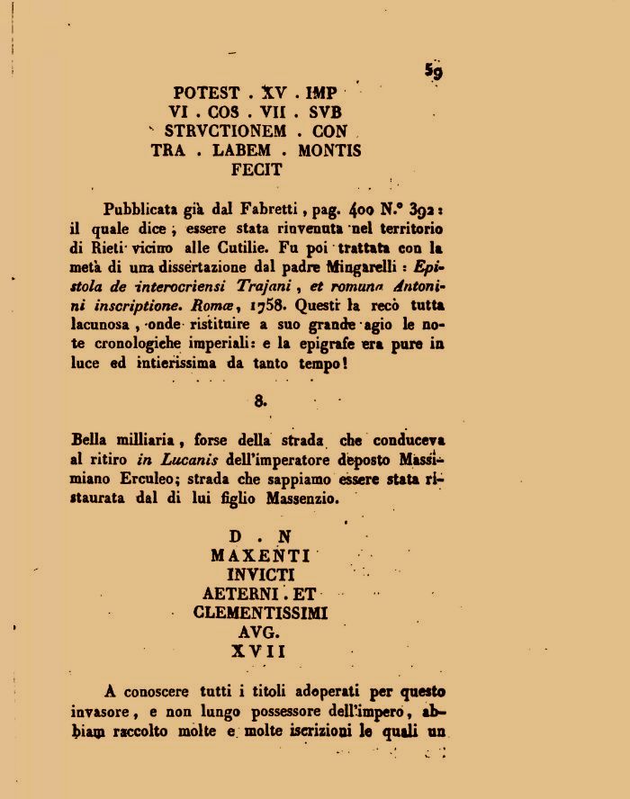 Pubblicata gik dal Fabretti, pag. 4<>0 N.° 3$a : il quale dice , essere stata rinvenuta nel territorio di Rieti' vicino alle Cutilie. Fu poi trattata con la meta di una dissertazione dal padre Mingarelli : Epistola de interocriensi Trajani, et romuna /intoni-ni inscriptione. Romae, 1758. Questi la recò tutta lacunosa ,-onde ristituire a suo grande agio le note cronologiche imperiali: e la epigrafe era pure in luce ed intierissima da tanto tempo!