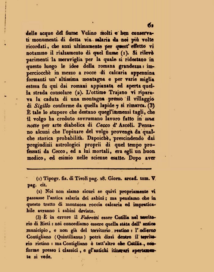 (2) Noi non siamo sicuri se quivi propriamente vi passasse l'antica salaria dei sabini ; ma pensiamo, ohe in questo tratto di montuosa roccia calcaria ed impratica-' bile avranno i sabini deviato.