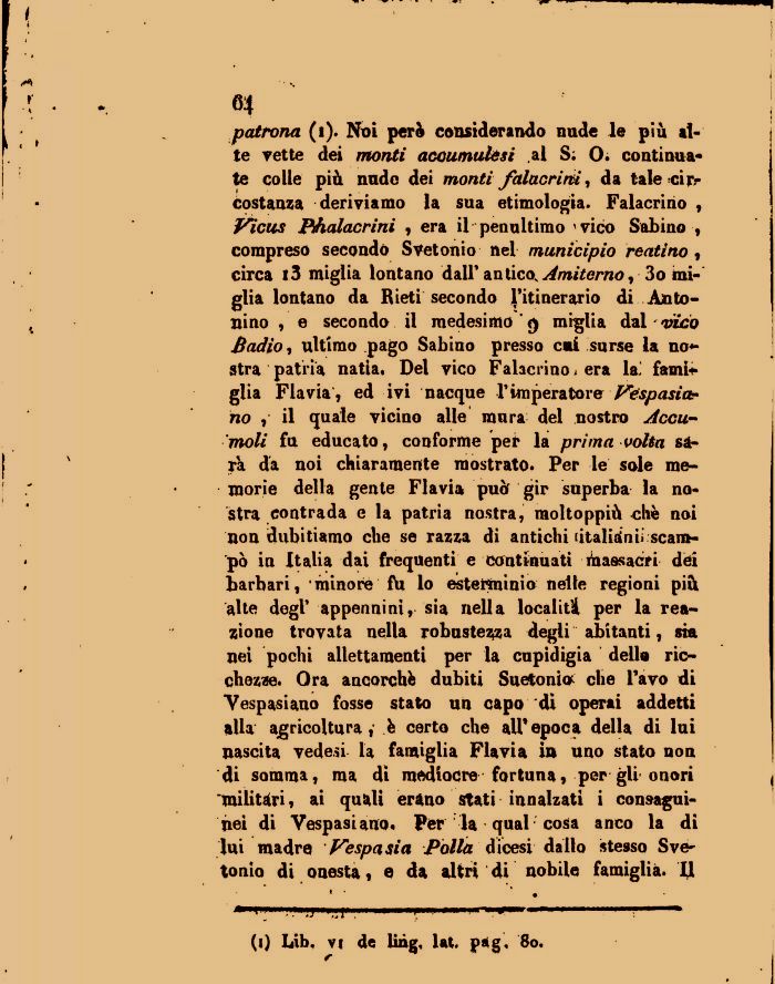patrona (i). Noi perą considerando nude le pił alte vette dei monti accumulasi al S; Oi continuate colle pił nudo dei monti falacriru, da tale circostanza deriviamo la sua etimologia. Falacrino , Ficus Phalacrini , era il penultimo 1 vico Sabino , compreso secondo Svetonio nel municipio reatino, circa i3 miglia lontano dall' antico, Amiterno, 3o miglia lontano da Rieti secondo l'itinerario di Antonino , e secondo il medesimomiglia ązģvico Radio, ultimo pago Sabino presso cui surse la no*-stra patria natia. Del vico Falacrino, era la> famiglia Flavia, ed ivi nacque Vimperatore Vespasiar ho , il quale vicino alle mura del nostro Accu-¦ moli fu educato, conforme per la prima volta sarą da noi chiaramente mostrato. Per le sole memorie della gente Flavia pucf gir superba la nostra contrada e la patria nostra, moltoppił che noi non dubitiamo che se razza di antichi titalidniģ scampņ in Italia dai frequenti e continuati Massacri dči barbari, minore fa lo estertninio nelle regioni pił alte degl' appennini, sia nella localitą per la reazione trovata nella robustezza degli abitanti, sia nei pochi allettamenti per la cupidigia dello ricchezze. Ora ancorché dubiti Suetonic* che l'avo di Vespasiano fosse stato un capo di operai addetti alla agricoltura,' h certo che ali*epoca della di lui nascita vederi la famiglia Flavia in uno stato non di somma, ma di mediocre fortuna, per gli onori 'militari, ai quali erano stati innalzati i consagui-hei di Vespasiano. Per la qual -cosa anco la di lui madre Vespa sia Polla dicesi dallo stesso Svetonio di onesta, e da altri di nobile famiglia. U « ¦ .