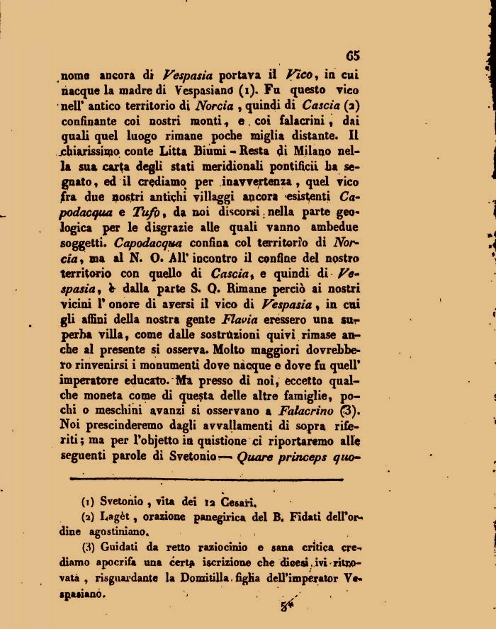 nome ancora di Vespasia portava ii Pico, in cui nacque la madre di Vespasiano (i). Fu questo vico nelT antico territorio di Norcia , quindi di Cascia (a) confinante coi nostri monti e , coi falacrini, dai quali quel luogo rimane poche miglia distante. Il chiarissimo conte Litta Biumi - Resta di Milano nella sua car{a degli stati meridionali pontificii ha segnato, ed il crediamo, per inavvertenza, quel vico fra due Rostri antichi villaggi ancora esistenti Ca-podacqua e Tu/q% da noi discorsi. nella parte geologica per le disgrazie alle quali vanno ambedue soggetti. Capodacqua confina col territorio di Norcia, ma al N. O. All'incontro il confine del nostro territorio con quello di Cascia, e quindi di Vespasia , è- dalla parte S. Q. Rimane perciò ai nostri vicini 1* onore di aversi il vico di Vespasia, in cui gli affini della nostra gente Flavia eressero una sur perba villa, come dalle sostrUzioni quivi rimase anche al presente si osserva* Molto maggiori dovrebbero rinvenirsi i monumenti dove nàcque e dove fu quell* imperatore educato. Ma presso di noi, eccetto qualche moneta come di questa delle altre famiglie, pochi o meschini avanzi si osservano a Falacrino (3). Noi prescinderemo dagli avvallamenti di sopra riferiti; ma per l'objetto in quistione ci riportammo alle seguenti parole di Svetonior— Quare princeps quo-