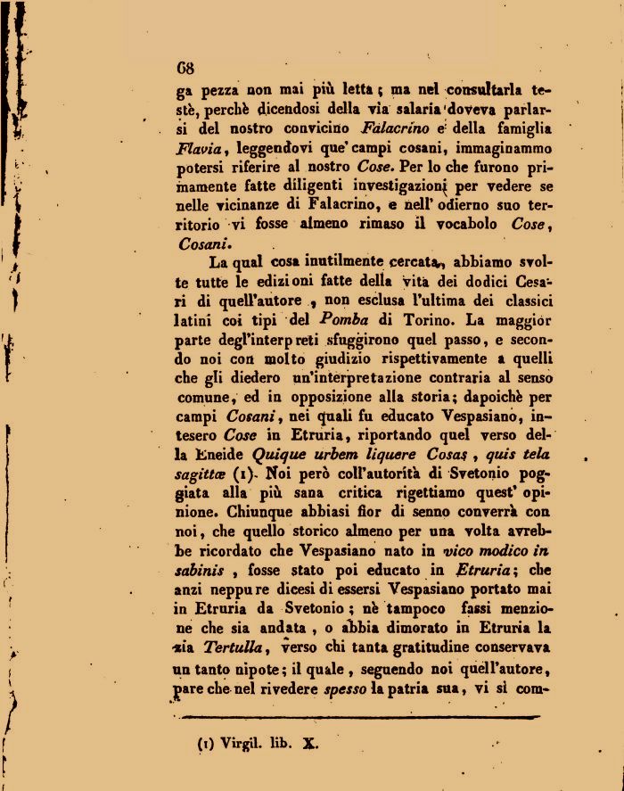 La qual cosa inutilmente cercatv, abbiamo svolte tutte le edizioni fatte della vita dei dodici Cesari di quell'autore t non esclusa l'ultima dei classici latini coi tipi del Pomba di Torino. La maggior parte degl'interpreti sfuggirono quel passo, e secondo noi con molto giudizio rispettivamente a quelli che gli diedero un'interpretazione contraria al senso comune, ed in opposizione alla storia; dapoichè per campi Cosani, nei quali fu educato Vespasiano, intesero Cose in Etruria, riportando quel verso della Eneide Quique urbem liquore Cosas , quis tela sagittee (i). Noi però coll'autorita di Svetonio poggiata alla più sana critica rigettiamo quest' opinione. Chiunque abbiasi fior di senno converrà con noi, che quello storico almeno per una volta avrebbe ricordato che Vespasiano nato in vico modico in sabinis , fosse stato poi educato in Etruria ; che anzi neppure dicesi di essersi Vespasiano portato mai in Etruria da Svetonio ; nè tampoco fassi menzione che sia andata , o abbia dimorato in Etruria la -zia Tertulla, verso chi tanta gratitudine conservava un tanto nipote; il quale , seguendo noi quell'autore, jpare che nel rivedere spesso la patria sua, vi si com-