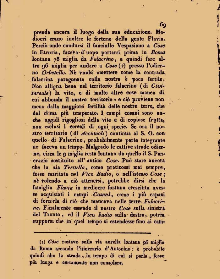 (1) Còse restava sulla vìa aurelia lontana 96 miglia da Roma secondo l'itinerario d'Antonino : è probabile quindi che la strada, in tempo di cui si parla , fosse più lunga e certamente non consolare.