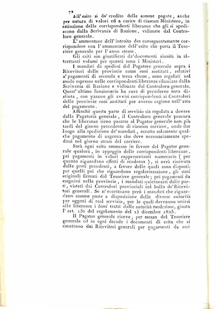 Sarà ogni esito ammesso in favore del Pagator generale qualora, in appoggio delle corrispondenti liberanze , pei pagamenti in valori rappresentanti numerario ( per quanto riguardano effetti di scadenza ) , si avrà ricevuta dalle parti prendenti, a favore delle quali sono disposti: per quelli poi che riguardono regolarizzazione, gli stati originali firmati dal Tesoriere generale; pei pagamenti da eseguirsi nelle provincie , i mandali quietanzati dalJe parti, vistati dai Controlori provinciali col bollo de'Ricevi-tori generali. Se n' eccettuano però i mandati che riguardano somme poste a disposizione delle diverse autorità per oggetti di real servizio, per le quali dovranno unirsi alle liberanze i boni tratti dalle autorità medesime, giusta l'art. i3o del regolamento del i5 dicembre i8a3.
