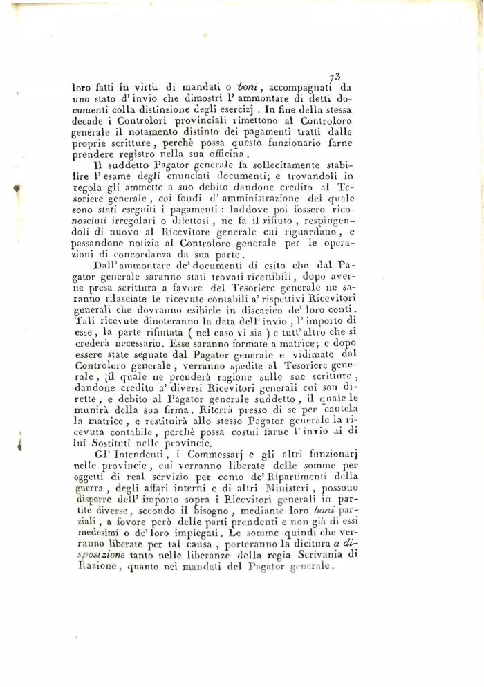 GÌ' Intendenti , i Commessarj c gli altri funzionar] nelle provincic , cui verranno liberate delle somme per oggetti di real servizio per conio de' Ripartimenti della guerra , degli affari interni c di altri Ministeri , possono disporre dell' imporlo sopra i Ricevitori generali in partite diverse, secondo il bisogno, mediante loro boni parziali , a fovore però delle parti prendenti e non già di essi medesimi o de' loro impiegati . Le somme quindi che verranno liberale per tal causa , porteranno la dicitura a disposizione tanto nelle liberanze della regia Scrivania di Razione, quanto nei mandali del Pagator generale.