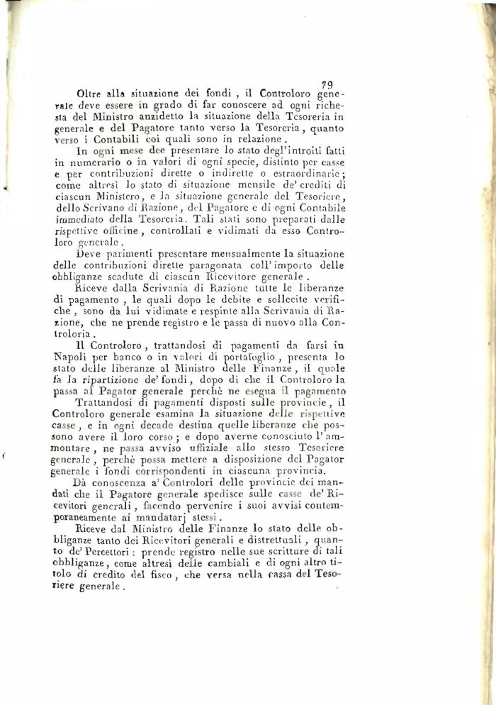In ogni mese dee presentare lo stato degl'introiti falli in numerario o in valori di ogni specie, distinto per casse e per contribuzioni dirette o indirette o estraordinarie; come altresì lo stato di situazione mensile de' credili di ciascun Ministero, e la situazione generale del Tesoriere, dello Scrivano di Razione, del Pagatore e di ogni Contabile immediato della Tesoreria. Tali slati sono preparati dalle rispettive oilii ine , controllati e vidimati da esso Controloro generale.