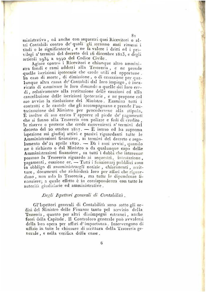 Agisce cernirò i Ricevitori e chiunque altro amministra fondi e rami addett i alla Tesoreria , e ne prende quelle iscrizioni ipotecarie chc crede utili ed opportune . In caso di morte, di dimissione, o di cessazione per qualunque altra causa de' Contabili dal loro impiego , è incaricato di esaminare le loro dimando o quelle dei loro erodi, relativamente alla restituzione delle cauzioni ed alla cancellazione delle iscrizioni ipotecarie , e ne propone col suo avviso la risoluzione del Ministro . Esamina tutti i contratti e le cautele che gli accompagnano e prende l'autorizzazione del Ministro per procedersene alla stipula, È inoltre di suo carico 1' apporre al piede de' pagamenti che si fanno alla Tesoreria con polizze e fedi di credito , le riserve o proteste che crede convenienti a' termini del decreto del 20 ottobre 1817. — È inteso ed ha suprema ispezione sui giudizj attivi e passivi riguardanti tutte le Amministrazioni finanziere, ai termini del decreto e regolamento de'2t aprile 1820. — Dà i suoi avvisi, quando ne è richiesto o dal Ministro o da qualunque capo delle Amministrazioni finanziere, su tutti i dubbi che interessar possono la Tesoreria riguardo ai sequestri, intestazione, pagamenti, esazione ec. — Tutti i funzionar] pubblici sono in obbligo di somministrargli notizie , chiarimenti, scritture , documenti che richiederà loro per affari che riguardano , non solo la Tesoreria , ma tutte le dipendenze finanziere; a quale effetto è in corrispondenza con tutte le autorità giudiziarie ed amministrative .