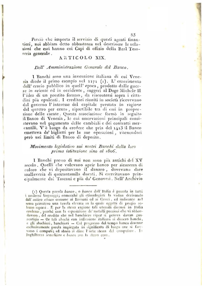 (1) Questa parola banco, o banca dall'Italia è passata in tutti 1 moderni linguaggi; comecché eli etimologisti la vadan derivando dall'antico abaco comune ai Romani ed ai Greci , ed indicante mi senso primitivo una tavola elevata su la quale oggetti di pregio solcano esporsi E per la stesa ragione tali utensili diconsi in Italia credenti', perché con la esposizione die* metalli preziosi ehe Ti abbondavano , del credilo che nel banchiere. 1 ipor sì poteva davan guarentigia — Or tali aliatili con inflessioni italiana si dissero banchi, v gli abacbicrì, banchieri — Col progresso del tempo banco divenne esclusivamente parola impiegala in -ignificalo di luogo ove si fai vano i computi; ed abaco fi HlSS< l'aite stessa del eomp'it.'ie J Inghilterra tracchiere e b'inri son la tcs-i cosa.