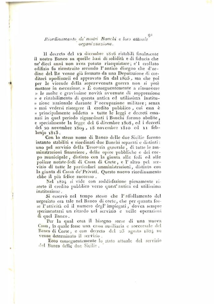 11 decreto del 12 dicembre i8i(> ristabilì finalmente il nostro Banco su quelle basi di solidità e di fiducia elle ne'dieci anni non avea polulo riacquistare; e'1 crollato edilizio fu ricostruito secondo l'antico disegno die d'ordine del Be venne già formato da una Deputazione di creditori apodissarii ed approvato fin dali8o5., ma che poi per le vicende della sopravvenuta guerra non si potè mettere in esecuzione. » È conscguentemente a rimuovere )> le molte e gravissime novità avvenute di soppressione )> e ristabilimento di questa antica ed utilissima institu-» zionc nazionale durante l'occupazione militare; senza » mai vedersi risorgere il credito pubblico , cui essa è » principalmente addetta » tutte le leggi e decreti emanati in quel periodo riguardanti i Banchi furono abolite , e specialmente la legge del 6 dicembre 1808, ed i decreti del 20 novembre 1809, 18 novembre 1S10 ed 11 febbraio i8i3.