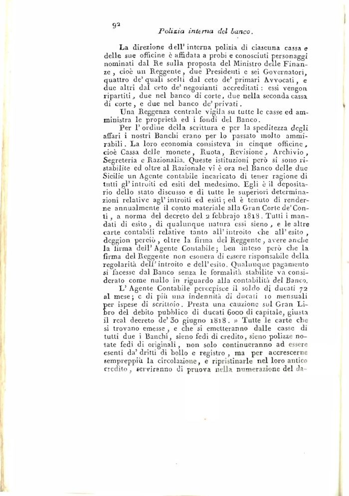 Per 1' ordine della scrittura e per la speditezza degli affari i nostri Banchi erano per lo passato molto ammirabili . La loro economia consisteva iu cinque officine, cioè Cassa delle monete, Ruota, Revisione, Archivio, Segreteria e Razionalia. Queste istituzioni però si sono ristabilite ed oltre al Razionale vi è ora nel Banco delle due Sicilie un Agente contabile incaricato di tener ragione di tulli gl'inlruili ed esili del medesimo. Egli è il depositario dello stalo discusso e dì tutte le superiori determinazioni relative agl'introiti ed esiti-, ed è tenuto di renderne annualmente il conto materiale alla Gi an Corte de'Conti , a norma del decreto del a febbrajo 1818. Tulli i mandali di esito , di qualunque natura essi sieno , e le altre carte contabili relative tanto all' introito che all' esilo , deggion perciò, oltre la firma del Reggente, avere anche la iirma dell'Agente Conlabile; ben inteso però che la firma del Reggente non esonera di essere risponsabilc della regolarità dell'introito e dell'esito. Qualunque pagamento si facesse dal Banco senza le formalità stabilite va considerato come nullo in riguardo alla conlabilità del Banco.