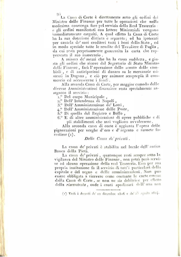La cassa de'privali, qualunque resti sempre sotto la vigilanza del Ministro delle Finanze, non potrà però servire ad alcuna operazione della real Tesoreria. Essa per sua propria inslituzione fa il servizio di lull'i particolari della, capitale e del regno c delle amministrazioni . Non può essere obbligala a ricevere come contante le carte envs.v. dalla Cassa di Corte, se non ne sia debitrice pei effetto della riscontrata, onde i conti apodissari ib-ll'una non