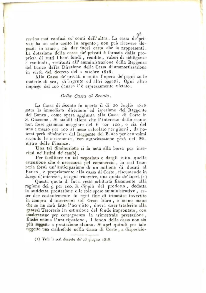 La Cassa di Sconto fu aperta il dì 20 luglio 1818 sotto la immediata direzione ed ispezione del Reggente del Banco, come opera aggiunta alla Cassa di Corte in S. Giacomo . Si stabilì allora che l'interesse dello sconto non fosse giammai maggiore del 6 per 100 , o sia del uno e mezzo per 100 al mese calcolalo per giorni , da potersi però diminuire dal Reggente dui Banco per centesimi secondo le circostanze , con autorizzazione però del Ministro delle Finanze.