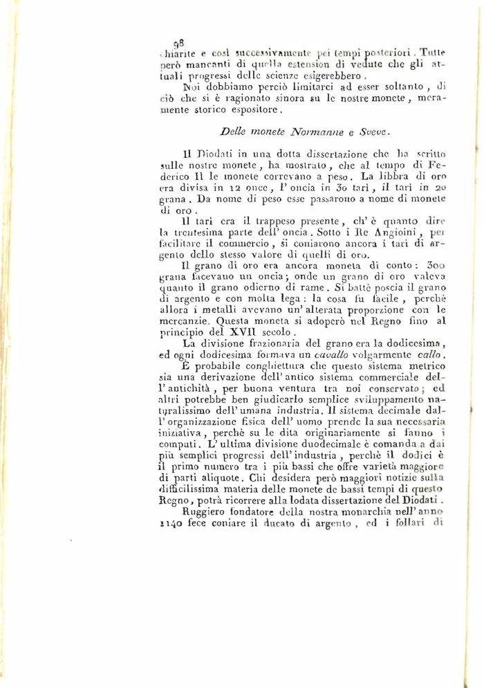 È probabile conghiettura clic questo sistema metrico sia una derivazione dell' antico sistema commerciale dell' antichità , per buona ventura tra noi conservato ; ed altri potrebbe ben giudicarlo semplice sviluppamento naturalissimo dell'umana industria. 11 sistema decimale dall' organizzazione fisica dell' uomo prende la sua necessaria iniziativa, perchè su le dila originariamente si fanno i computi. L' ultima divisione duodecimale è comanda a dai più. semplici progressi dell'industria, perchè il dodici è il primo numero tra i più. bassi che offre varietà maggiore di parti aliquote. Chi desidera però maggiori notizie sulla difficilissima materia delle monete de bassi tempi di questo Regno, potrà ricorrere alla lodala dissertazione del Diodati .