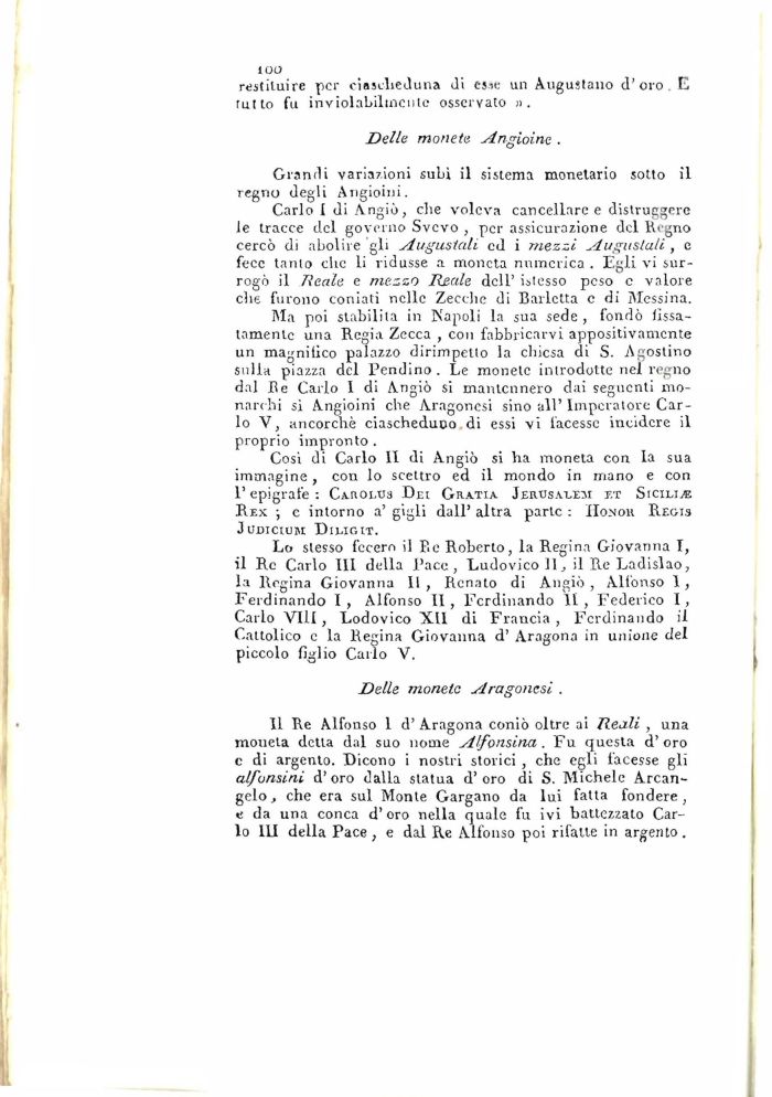Ma poi stabilita in Napoli la sua sede, fondò fissatamente una Regia Zecca , con fabbricarvi appositivamente un magnifico palazzo dirimpetto la chiesa di S. Agostino sulla piazza del Pendino . Le monete introdotte nel regno dal Be Carlo I di Angiò si mantennero dai seguenti monarchi sì Angioini che Aragonesi sino all' Imperatore Carlo V, ancorché ciascheduno di essi \i facesse incidere il proprio impronto .