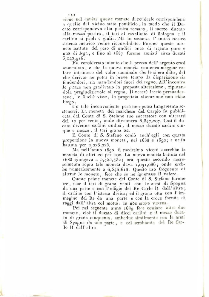 Queste prime monete del Conte di S. Stefano furono tre , cioè il tari di grana venti con le armi di .Spagna da una parte e con l'effigie del Re Carlo 11 dall'altra; il carlino con l'islessa divisa ; ed il grana otto con 1' im magine del Re da una parte e con la croce fornita di raggi dall' altra col motto ; in hoc signo visces .