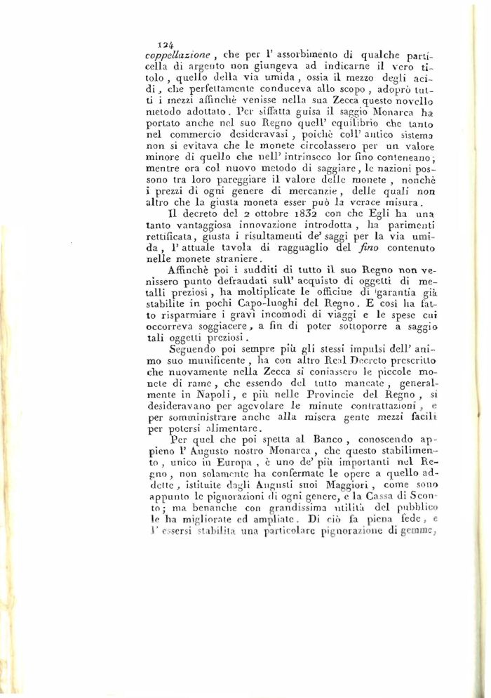 Seguendo poi sempre piti gli slessi impulsi dell' animo suo munificente , ha con altro Real Decreto prescritto che nuovamente nella Zecca si coniassero le piccole monete di rame , che essendo del tutto mancale , generalmente in Napoli, e più nelle Provincie del Regno, si desideravano per agevolare le minute contrattazioni , e per somministrare anche alla misera gente mezzi facili per potersi alimentare.