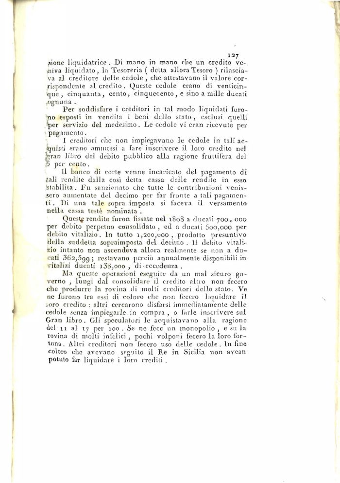 Ma queste operazioni eseguile da un mal sicuro governo , lungi dal consolidare il credito aliro non fecero che produrre la rovina di molti creditori dello stalo. Ve ne furono Ira essi di coloro che non fecero liquidare il >oro credito : altri cercarono disfarsi immediatamente delle cedole senza impiegarle in compra , o farle inscrivere sul Gran libro. Gii speculatori le acquistavano alla ragione del n al 17 per ioo . Se ne fece un monopolio, e su la rovina di molli infelici , pochi volponi fecero la loro fortuna. Altri creditori non fecero uso delle cedole. Infine coloro che avevano seguilo il Re in Sicilia non avean potuto far liquidare i loro credili .