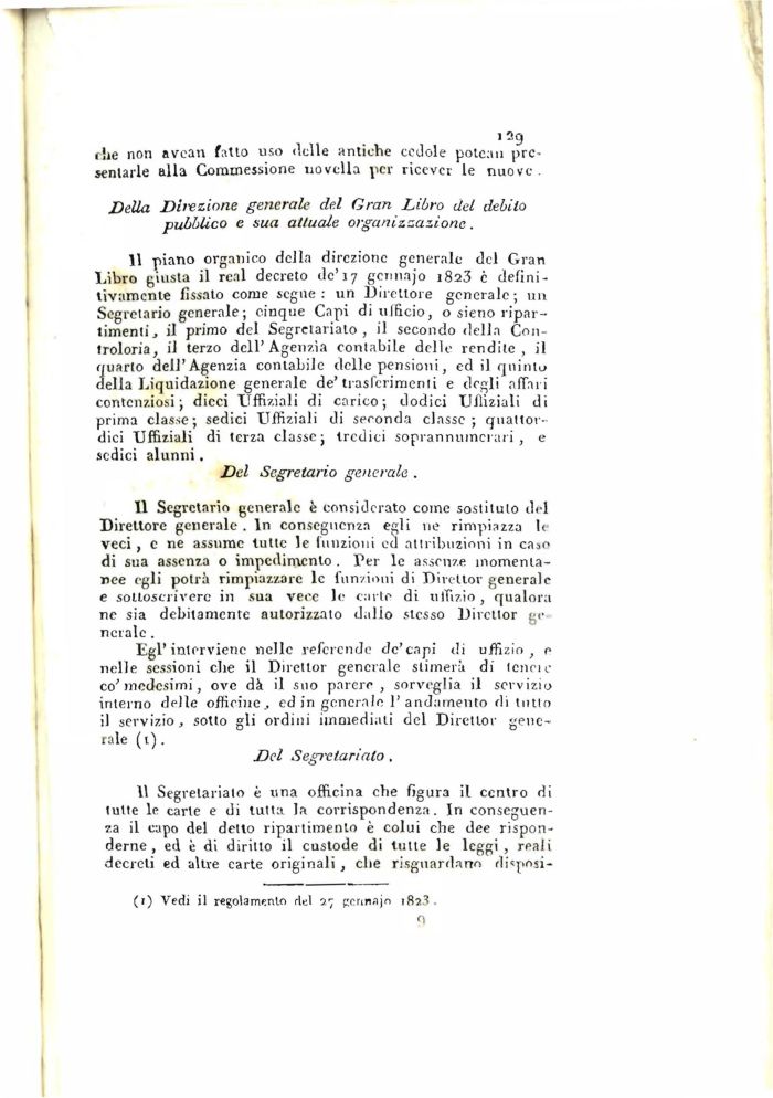 11 piano organico della direzione generale del Gran Libro giusta il real decreto de'17 germajo 1823 č definitivamente fissato come segue: un Direttore generale; un Segretario generale; cinque Capi di ulficio, o sieno ripartimenti, il primo del Segretariato, il secondo della C011-troloria, il terzo dell'Agenzģa contabile delle rendite, il quarto dell'Agenzia contabile delle pensioni, ed il quinto della Liquidazione generale de'trasferimenti e degli affari contenziosi; dicci LTffiziali di carico; dodici Uflģziali di prima classe; sedici LTffiziali di seconda classe; quattordici Uffiziali di terza classe; tredici soprannumerari, e sedici alunni.