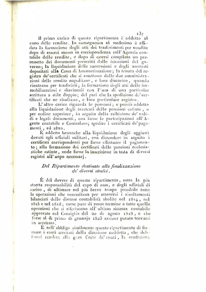 il primo carico di questo ripartiirienlo è addetto al ramo dello rendite. In conseguenza ni medesimo è affidata la torma/,ione degli alti dei trasferimenti per vendite dopo di essersi messo in corrispondenza coli' Agenzìa -contabile delle rendile, e dopo di essersi compilalo un pro-cessetlo dei documenti presentii dalle istruzioni del governo-, la liquidazione delle successioni e citigli arretrali depositali alla Cassa di \ininortizzazùmc ; la tenuta del registro de' certilicati che si emettono dalle due amministra-zioni delle rendile napolitano , e loro discarico , quando rientrano per trasferirsi; la formazione degli alti delle immobilizzazioni e disvincoli con l'uso di una particoiar scrittura a siile doppio; deipari che la spedizione de'certificali che ne risultano , c loro particolare registro .