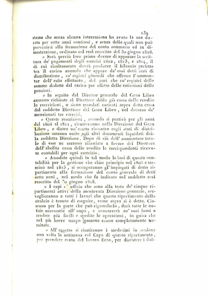 » Assodale quindi in tal modo le basi di questa contabilità per la gestione the ebbe principio nel 1800 e terminò nel 1815 , si oc cuperanno gl'impiegali di dello ri-partinienlo alla formazione del conto generale di detti sette anni , nel modo clic fu indicato nel suddetto real rescritto del giugno 1818.