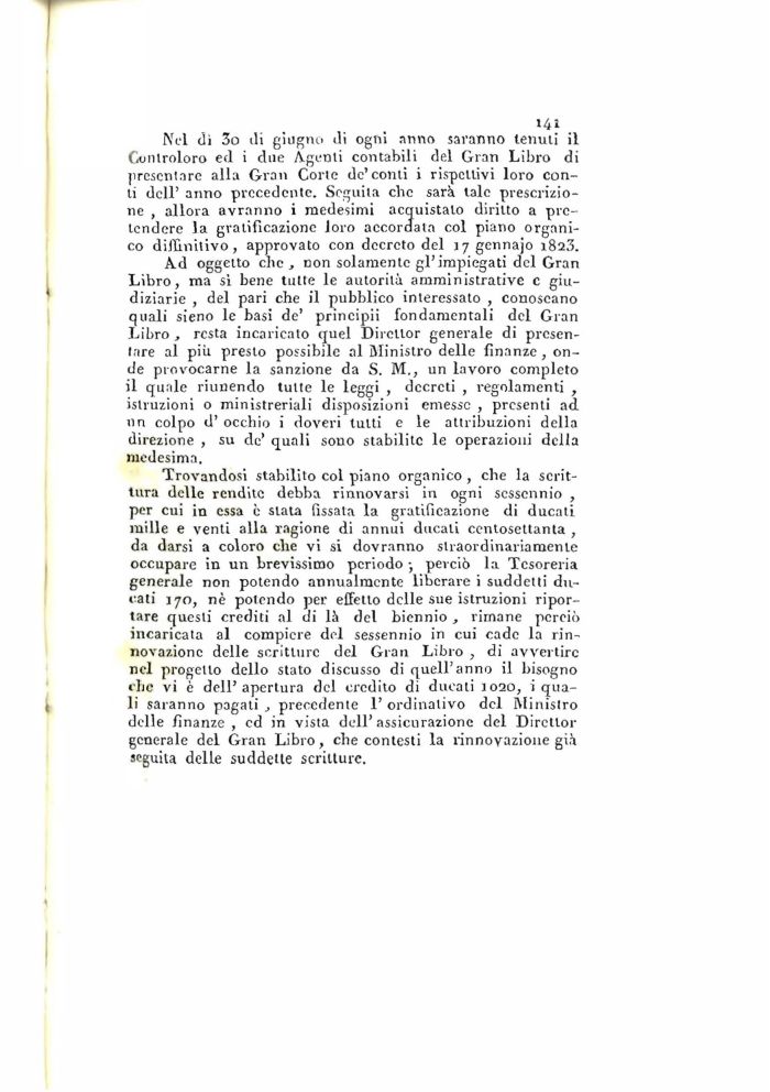 Trovandosi stabilito col piano organico , che la scrittura delle rendite debba rinnovarsi in ogni sessennio , per cui in essa è slata fissata la gratificazione di ducati mille e venti alla ragione di annui ducali ccntosettanta , da darsi a coloro che vi si dovranno straordinariamente occupare in un brevissimo periodo -, perciò la Tesoreria generale non potendo annualmente liberare i suddetti ducati 170, nè potendo per effetto delle sue istruzioni riportare questi crediti al di là del biennio , rimane perciò incaricata al compiere del sessennio in cui cade la rinnovazione delle scritture del Gran Libro , di avvertire nel progetto dello stato discusso di quell'anno il bisogno che vi è dell'apertura del credito di ducati 1020, i quali saranno pagali , precedente 1' ordinativo del Ministro delle finanze , ed in vista dell'assicurazione del Diretlor generale del Gran Libro, che contesti la rinnovazione già seguita delle suddette scritture.